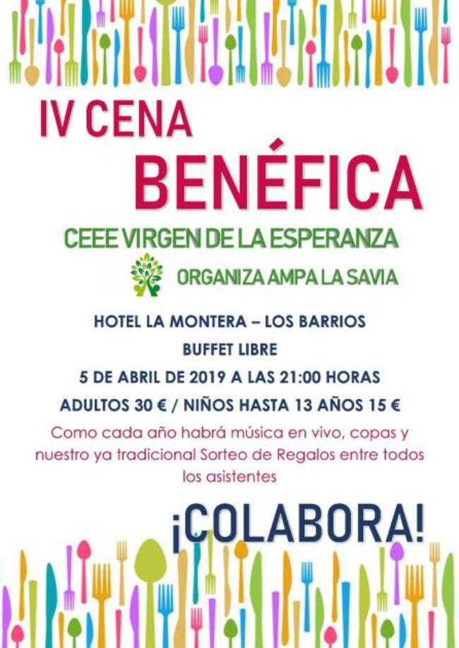 Esta es ya la cuarta edición de la Cena Benéfica que organiza la Asociación de Madres y Padres de Alumnos del Colegio de Educación Especial Virgen de la Esperanza, y que como en años anteriores han elegido el Hotel Montera de Los Barrios para esta celebración que contará con música en vivo, baile, copas y un espectacular sorteo de regalos.
