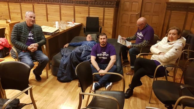 Continua el encierro en el Ayuntamiento gijonés para exigir el plan de vías. Los participantes siguen sin noticias de los gobiernos central y regional, a quienes tratan de meter presión con esta protesta. La plataforma vecinal se dirige ahora al secretario general de los socialistas asturianos, Adrián Barbón, para que actúe y medie en el conflicto.