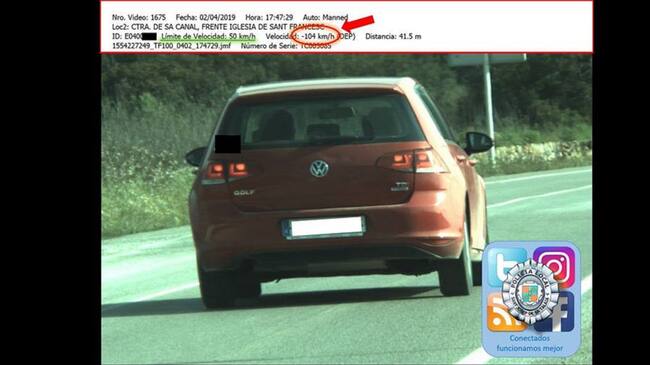La Policía Local de Sant Josep ha 'cazado' al conductor de un turismo a 104 km/h en la carretera de ses Salines, en un tramo de vía urbana, donde la velocidad máxima es de 50 km/h.