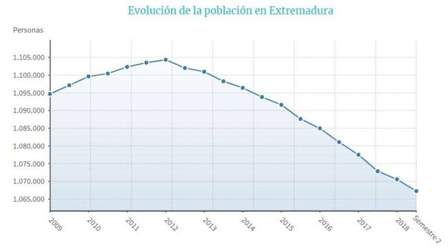 La comunidad autónoma de Extremadura ha registrado un descenso de 5.865 habitantes durante el pasado año 2018, lo que supone una caída del 0,5 por ciento con respecto al año anterior, por lo que su población se sitúa en 1.066.998 personas