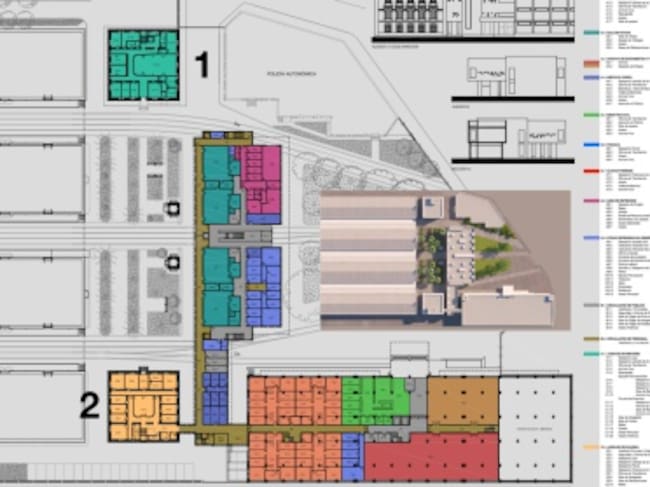 Como puede observarse en los planos, existen dos pequeños edificios (1 y 2) a ambos lados, de forma cuadrada. Ambos edificios, de 3 plantas de altura, y de 288 metros cuadrados cada una de ellas, serían reformados y dotados de nueva distribución para formar parte de la ciudad de la justicia. Uno de ellos, el que está situado más arriba de la fotografía (1), albergaría el juzgado de menores, y el que está justo en frente (2), el juzgado de guardia, servicios comunes como biblioteca, sala de videoconferencias y despachos, y en segunda planta, la fiscalía.