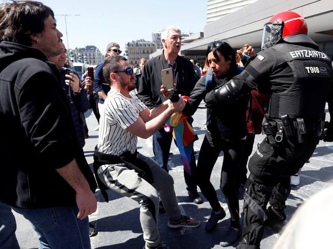 El cordón policial con el que la Ertzaintza trató de contener a los manifestantes resultó insuficiente, ya que varios de ellos lograron zafarse y alcanzaron a los simpatizantes de Vox en los aledaños del Kursaal, donde les empujaron, agredieron y arrebataron banderas.