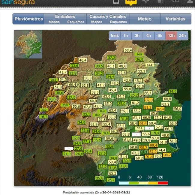 Los pluviómetros de la Confederación Hidrográfica del Segura (CHS) han recogido en las últimas 24 horas hasta 107 litros por metro cuadrado en su estación de El Palmar (Murcia), mientras que en la rambla de Benipila, a su paso por Cartagena, las cantidades recogidas en ese mismo periodo han sido de 108 l/m2.