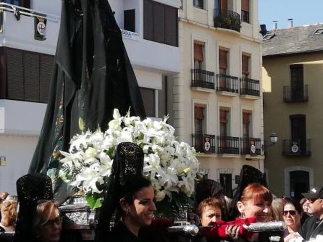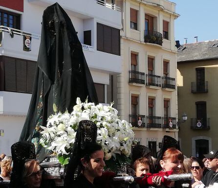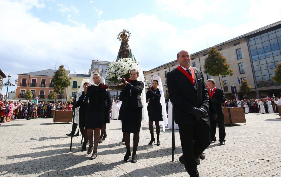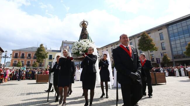 Tras la retirada del luto a la Patrona del Bierzo, señoras de mantilla blanca tomaron el relevo para portar a la Virgen hasta la Basílica donde se celebró la misa de Pascua.
