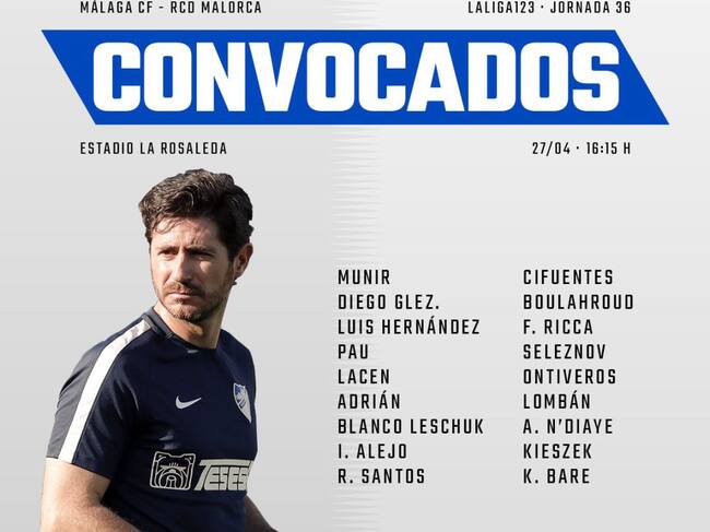Víctor Sánchez del Amo convocó a 18 jugadores para recibir el sábado al Mallorca en La Rosaleda (16:15 h). El técnico ha recuperado a Diego González, Boulahroud y Seleznov y dejó fuera por decisión técnica a Torres y Mula. Harper se perderá el encuentro por lesión.