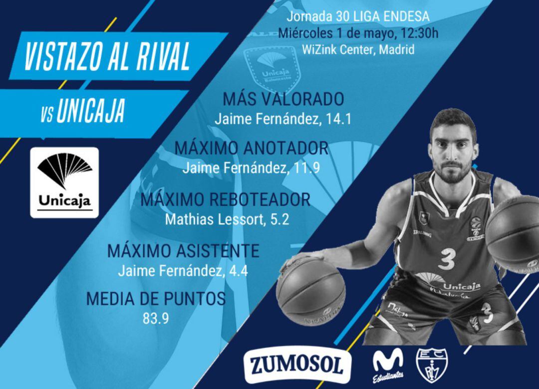 En un principio, el Unicaja es el favorito para ganar al Movistar Estudiantes, que adelantó su compromiso de la jornada trigésima de la Liga Endesa al tener el pabellón ocupado este fin de semana y, que en la pasada jornada cayó frente al Herbalife Gran Canaria en el mismo escenario, además de la diferencia clasificatoria, aunque ya sucumbió en lugares como Burgos, Lugo con el Café Candelas Breogán o Santiago de Compostela ante el Monbus Obradoiro.