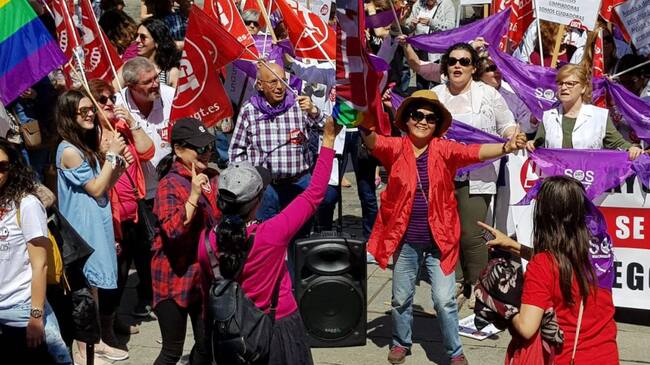 Las visitantes orientales no han dudado en enarbolar la banderas sindicales y sus carteles con proclamas y bailar al ritmo del tema de Marisol “Corazón contento” ante la sorpresa de los asistentes a la manifestación reivindicativa.