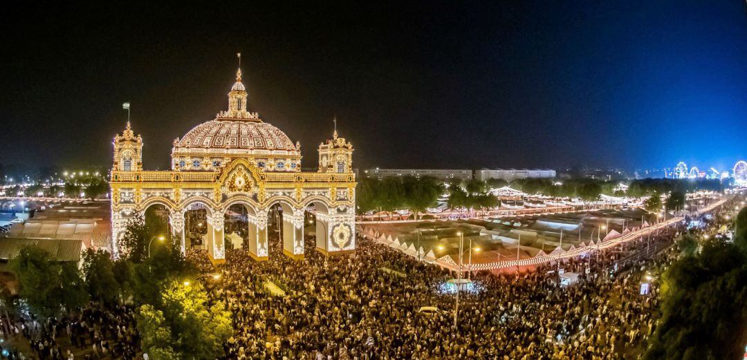La cita que ha arrancado esta noche ha tenido como protagonista la portada de la feria, inspirada en esta ocasión en el Casino de la Exposición de 1929, con una altura de 50 metros y con 24.000 bombillas, cuyo encendido ha dado paso a la cena del “pescaíto".