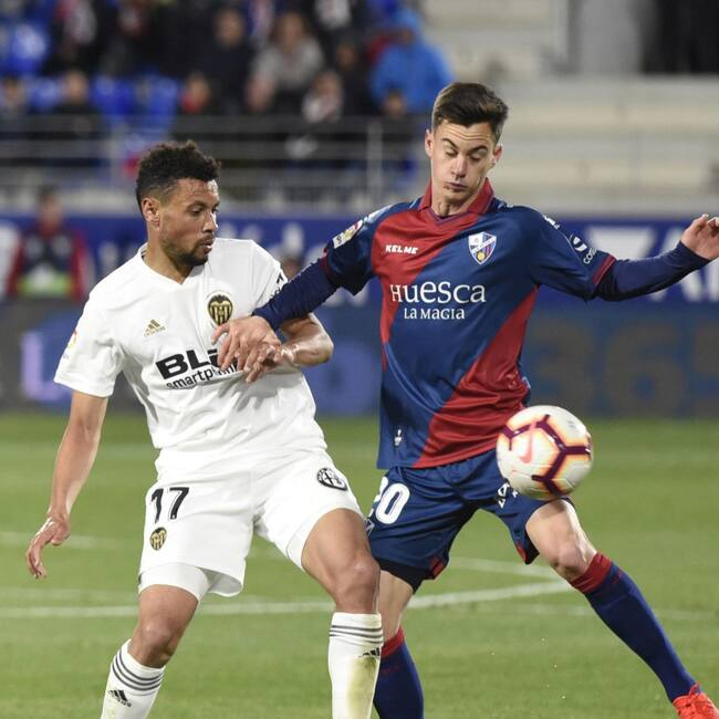 GRAF4417. HUESCA, El centrocampista venezolano de la SD Huesca Juampi Añor (d) lucha con el francés Francis Coquelin, del Valencia CF, durante el partido de la 36ª jornada de Liga en Primera División que SD Huesca y Valencia CF juegan esta noche en el campo de El Alcoraz, en Huesca. EFE, JAVIER BLASCO / JAVIER BLASCO (EFE)