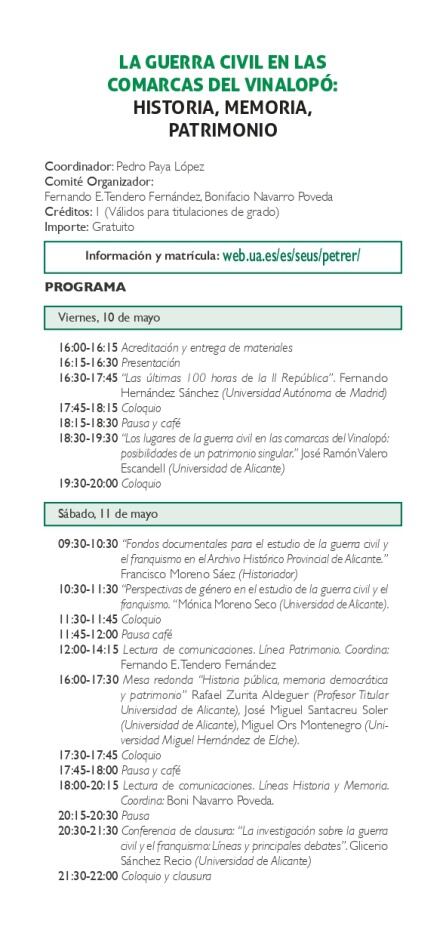 La inauguración tendrá lugar está tarde, a las 16:30 horas, correrá a cargo de Fernando Hernández Sanchez, Doctor en Historia Contemporánea y profesor de la Universidad Autónoma de Madrid, con la conferencia “Las últimas 100 horas de la II República. A continuación, será el turno del profesor de la Universidad de Alicante, Jº Ramón Valero Escandell, con la ponencia “Los lugares de la guerra civil en las comarcas del Vinalopó…”.