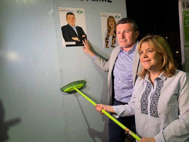 En el entorno del río Segura, frente al ayuntamiento de Murcia, tenía lugar anoche la pegada de carteles de VOX, que también quiere ser la fuerza determinante de la Asamblea Regional.