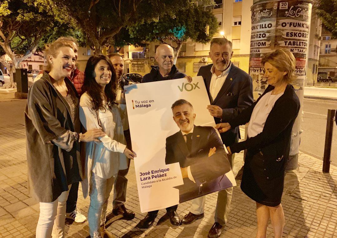 Al grito de "Viva España, Viva", ha iniciado la campaña electoral Vox en Málaga este jueves en la Carretera de Cádiz. En la simbólica pegada de carteles estaba la candidatura que encabeza José Enrique Lara junto a su número dos por el Ayuntamiento de la capital malagueña, Sonia Crespo.