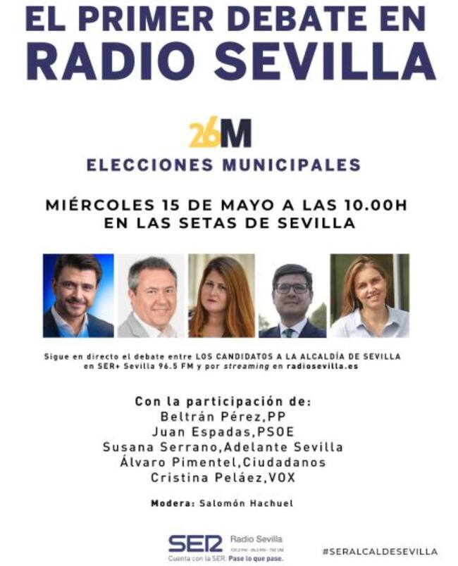 Radio Sevilla de la Cadena SER ofrecerá este próximo miércoles 15 de mayo, de 10 a 11 horas, el primer debate de las elecciones municipales de la ciudad de Sevilla con los 5 candidatos del PP, Beltrán Pérez; del PSOE, Juan Espadas; de Adelante Sevilla, Susana Serrano; de Ciudadanos, Álvaro Pimentel, y de Vox, Cristina Peláez.