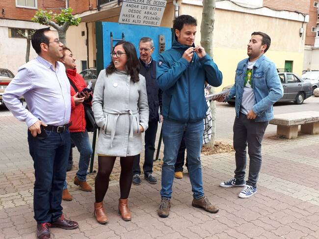 El candidato de Podemos a la alcaldeía de Aranda, Andrés Gonzalo (izda) ha estado acompañado hoy por los procuradores y candidatos burgaleses a las Cortes de Castilla y León por el mismo partido Laura Domínguez y Félix Díaz junto a otros miembros de la candidatura municipal / Cadena SER