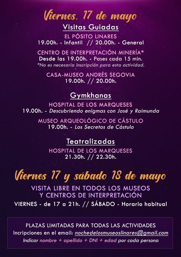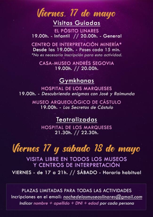 Además de todo este programa de actividades que se realizarán el viernes 17, la ciudad abrirá sus puertas a la cultura y el arte, el sábado 18 de mayo donde se podrán visitar todos sus espacios museísticos, de manera gratuita en su horario habitual. El aforo para todas las actividades organizadas es limitado por lo que se precisa inscripción, de forma gratuíta, para la reserva de plaza a través del email nochedelosmuseoslinares@gmail.com. Para todas las actividades se permitirá la inscripción de un máximo de 5 personas por dirección email.