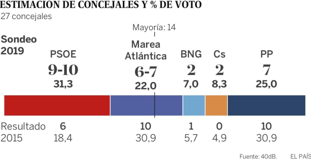 La encuesta de 40 dB para El País (realizada con 800 entrevistas entre el 29 de abril y el 2 de mayo) prevé prácticamente un intercambio de papeles entre PSOE y Marea Atlántica. Los socialistas ganarían las elecciones con 9-10 concejales (Marea tiene ahora 10), mientras que los de Xulio Ferreiro quedarían como tercera fuerza con 6-7 ediles (el PSOE tiene ahora 6). El BNG pasaría de 1 a 2.