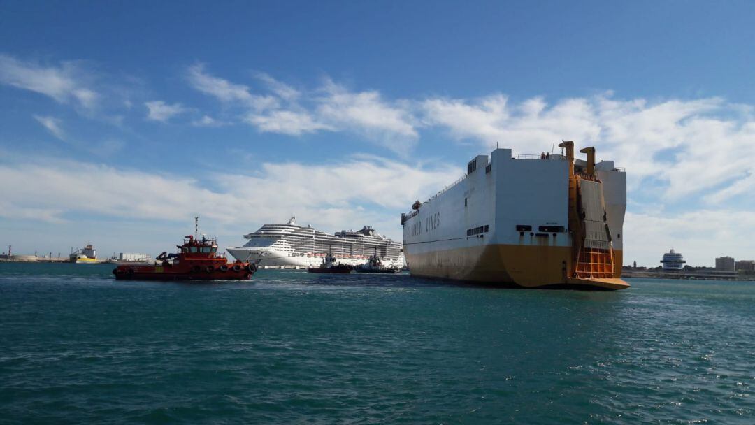 Minutos antes de las seis de la tarde de este lunes el carguero incendiado 'Grande Europa' de la compañía Grimaldi Lines ha salido desde Palma a remolque para llegar al puerto de Valencia.