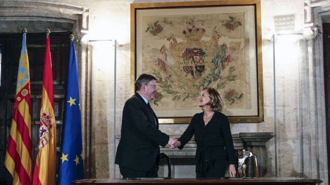 Foto de archivo: El president de la Generalitat, Ximo Puig, y la vicepresidenta de la Fundación Amancio Ortega, Flora Pérez, firman un convenio de colaboración para la donación de equipos oncológicos para hospitales de la Comunitat Valenciana / Manuel Bruque (EFE)