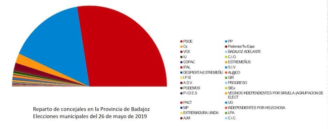 Además consiguieron concejales entre otros partidos Vox, IU, Extremeñus, Badajoz adelante y otras 26 formaciones políticas.
