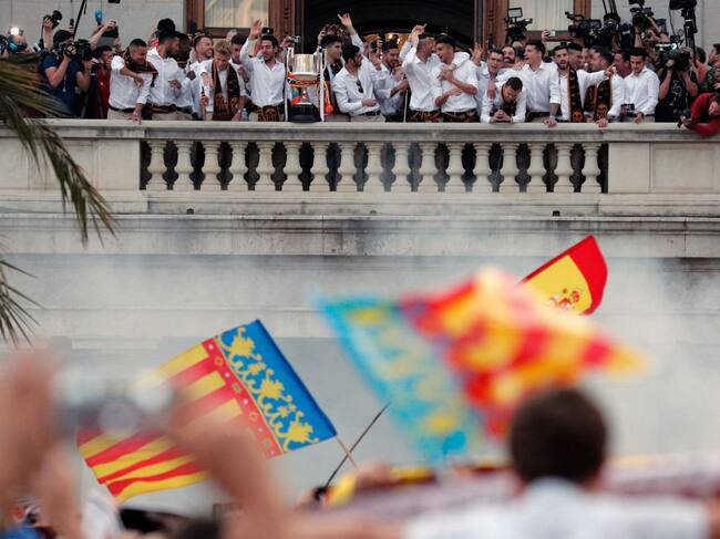 Los jugadores del Valencia CF celebran desde el balcón del Ayuntamiento de la Ciudad el título de la Copa del Rey / Kai Försterling (EFE)