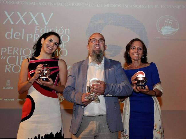 El delegado de la Agencia Efe en Argelia, Libia y Túnez, Javier Martín, ha ganado el XXXV Premio de Periodismo Cirilo Rodríguez, donde han resultado finalistas las corresponsales en Jerusalén para el Periódico de Catalunya, Ana Alba (d), y de El País en Líbano y Siria, Natalia Sancha (i).