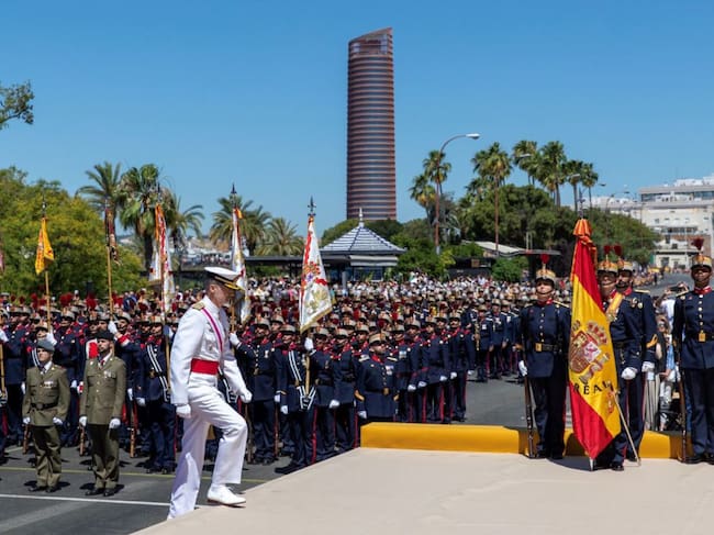 Los reyes Felipe y Letizia presiden este sábado en Sevilla las celebraciones del Día de las Fuerzas Armadas, que han reunido a decenas de miles de sevillanos y turistas junto al río Guadalquivir para presenciar el desfile militar.