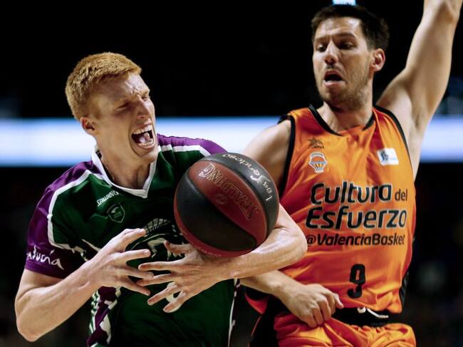 GRAF2549. MÁLAGA, El base del Unicaja Málaga Alberto Díaz (i), disputa un balón con el base belga del Valencia Basquet Sam Van Rossom (d), durante el segundo partido del playoff de cuartos de final de la Liga Endesa que se disputa esta tarde en el Palacio de Deportes José Mª Martín Carpena, en Málaga. EFE, Jorge Zapata / Jorge Zapata (EFE)