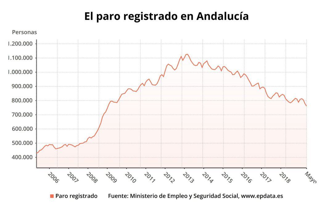 El número de parados registrados en las oficinas del Servicio Andaluz de Empleo (SAE) se redujo en mayo en 17.981 personas respecto al mes anterior, un 2,3 %, hasta sumar en total 761.113 desempleados.