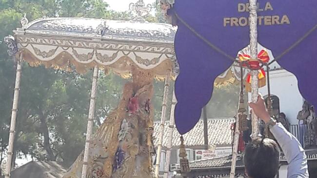 Sobre las 11:00h. de este lunes la Virgen del Rocío ha pasado por la casa de la Hermandad de Jerez en la aldea