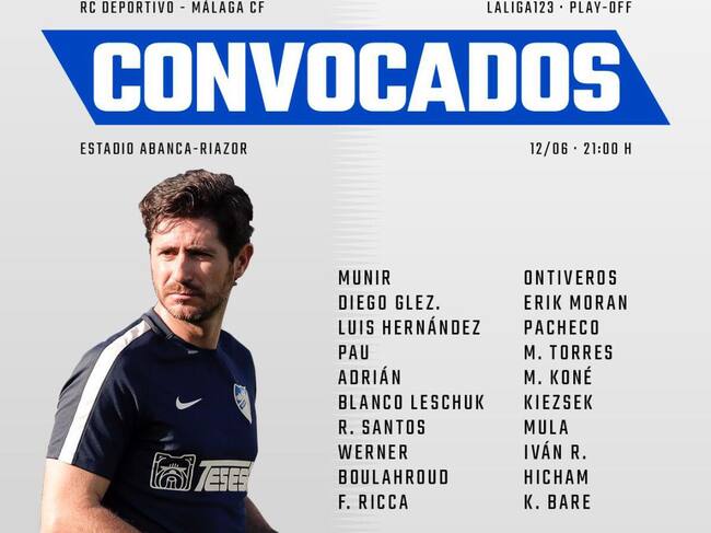 El centrocampista del Málaga Erik Morán, es la principal novedad en la convocatoria para el partido de ida de la eliminatoria de ascenso a Primera ante el Deportivo en Riazor.