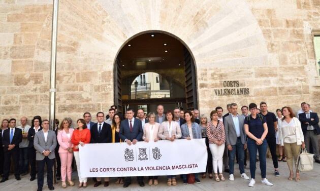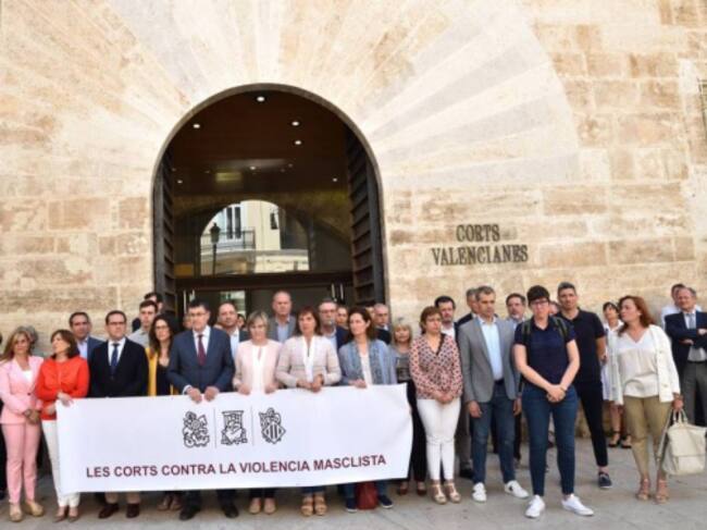 Les Corts contra la violencia masclista. Es la pancarta tras la que no se quisieron situar las diputados autonomicos de Vox tras la muerte de Beatriz, una joven de 29 años asesinada por su pareja en Alboraya. La víctima mil desde que hay estadisticas.