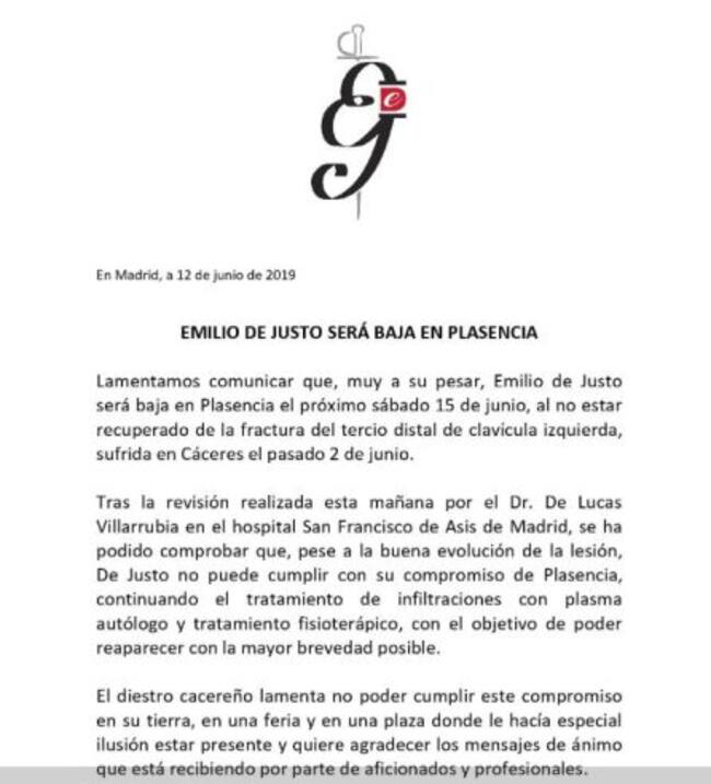 En el ambito taurino hay modificaciones ya que Emilio de Justo se cae de la corrida del sábado y será sustituido por Ginés Marín que acompañará a Morante de la Puebla y Manzanares en el Coso de las Golondrinas placentino.