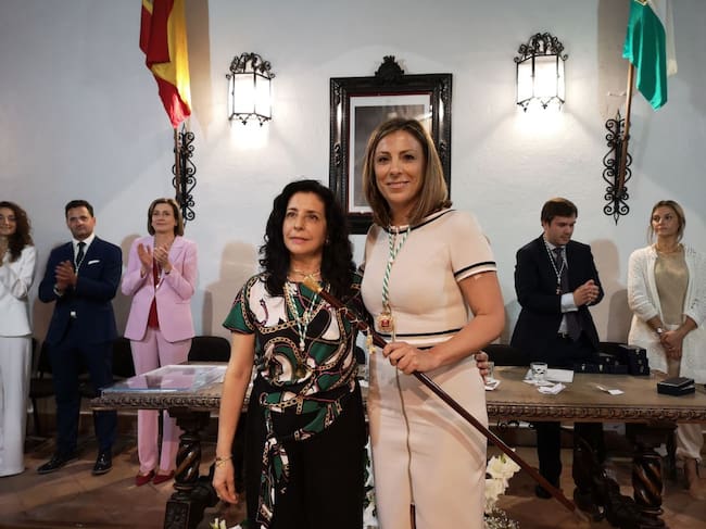 Josefa Valle (APR) entrega el bastón de mando a la nueva alcaldesa de Ronda, María Paz Fernández (PP). Ambos partidos gobernarán la ciudad de Ronda los próximo cuatro años.