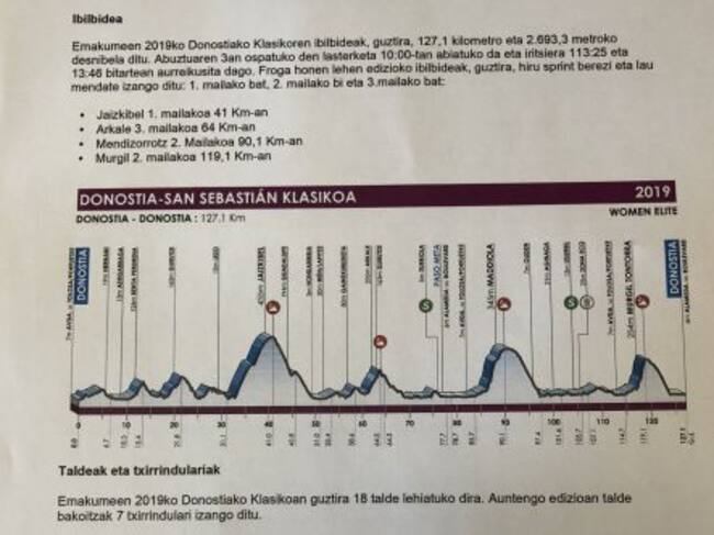 Esa primera edición de la Clásica San Sebastián femenina contará con los mejores 18 equipos del pelotón ya confirmados, y tendrá un recorrido de 127 kilómetros con cuatro puertos de montaña, Jaizkibel (1ª), Arkale (2ª), Mendizorrotz (2ª) y Murgil Tontorra (2ª). La peculiaridad es que el recorrido será idéntico en ambas carreras en el inicio y en el final, mientras que la diferencia está en la vuelta por Gipuzkoa que realizarán los chicos y no realizarán las ciclistas femeninas. La salida de la clásica femenina está prevista a las 11.00 horas, con un primer paso por el Boulevard estimado para las 12.15 y un final que será sobre las 13.30 horas.