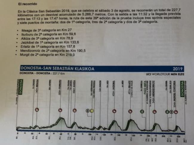La clásica masculina volverá a pasar por Urnieta y las calles de Hernani y Astigarraga para evitar problemas de tráfico en la autovía A-15, tendrá como el año pasado 227 kilómetros, y contará con siete puertos puntuables: Meaga (3ª), Iturburu (2ª), Alkiza (3ª), Jaizkibel (1ª), Erlaitz (1ª), Mendizorrotz (2ª) y Murgil Tontorra (2ª). El primer paso por el Boulevard será sobre las 16.00 y la llegada se prevé hacia las 17.30 horas.