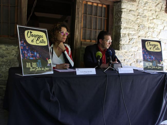 La cap de Cultura del comú de Sant Julià, Laura Rogé, i el conseller de Cultura, Josep Lluís Donsión, durant la presentació dels Vespres d'estiu 2019. / M.P. (ANA)