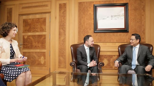 La ministra d'Afers Exterior, Maria Ubach, el cap de Govern, Xavier Espot i l'ambaixador de la Xina a Andorra, Lyu Fan. / C.Esteve/ SFGA