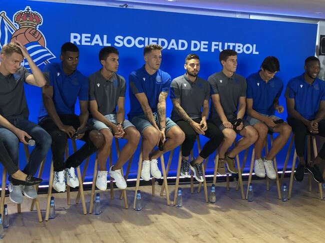 Los fichajes de la Real Sociedad se han presentado en una megapresentacion en Anoeta que ha servido de puerta de largo del nuevo proyecto realista que echa a andar este lunes con el primer entrenamiento en Zubieta. Ha sido el presidente, Jokin Aperribay, el encargado de darles la bienvenida en uno de los palcos del renovado campo de fútbol a los cinco refuerzos para esta próxima temporada (Portu, Isak, Remiro, Odegaard y Sagnan) junto con los jugadores de la cantera que pasan a formar parte de la primera plantilla (Le Normand, Guevara y Aihen Muñoz). Solo faltaba Barrenetxea, que está concentrado con la selección sub-19. “Odegaard viene por dos años, ha sido la conversación con el Real Madrid, pero federativamente sera 1+1. Isak desde que nos comunicamos con él mostró mucha ilusión y estará cinco años con nosotros. Guevara lo ha hecho fenomenal en el Sanse han sido años buenísimos y esperemos que sigas con tu mismo carácter y personalidad. Sigue por el camino recto. Alex Remiro mis palabras para ti son especiales. Agradecerte que estés aquí y estamos encantados de que tengamos un grandísimo jugador más. Has venido a una casa que te recibe con la puerta abierta de par en par. Portu es el veterano de este grupo. Había que verle a Imanol lo contento que estaba cuando le dijimos que venías. Aihen es una alegría verte con esa sonrisa. Lo hiciste fenomenal y este año será difícil. Le Normand, gracias por ser como eres, tienes gran carácter y personalidad. Y Sagnan fue nuestro primer fichaje, en enero, es muy joven, paciencia, pero estamos seguros de que lo va a dar todo aquí en esta etapa en la Real. Es un año muy ilusionabte. Es una Real muy joven, pero la fuerza de la juventud es la que le ha impulsado siempre a la Real”. Después, ya ha sido el turno para presentar a cada jugador.