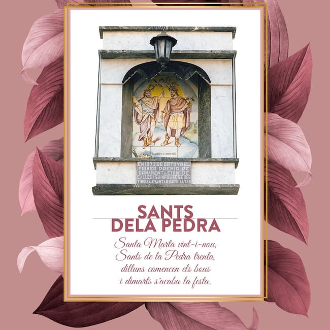 Encarando la recta final de las fiestas, el martes 30 habrá misa de campaña en honor als Sants de la Pedra, el canto dels “GOJOS” y la entrega de ramilletes a los festeros 2020; todo a partir de las 19:30 horas. Acto seguido, cena popular a las 21:30; y actuación del trio JAM a las 23:30 horas.
