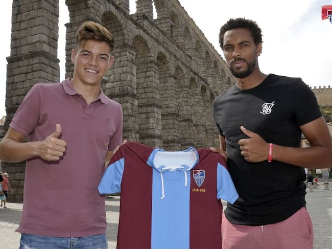 Rui, a la izquierda, posa en el Acueducto junto al guardameta David García que ya jugó ante el Real Madrid Castilla en el primer partido de pretemporada / Radio Segovia
