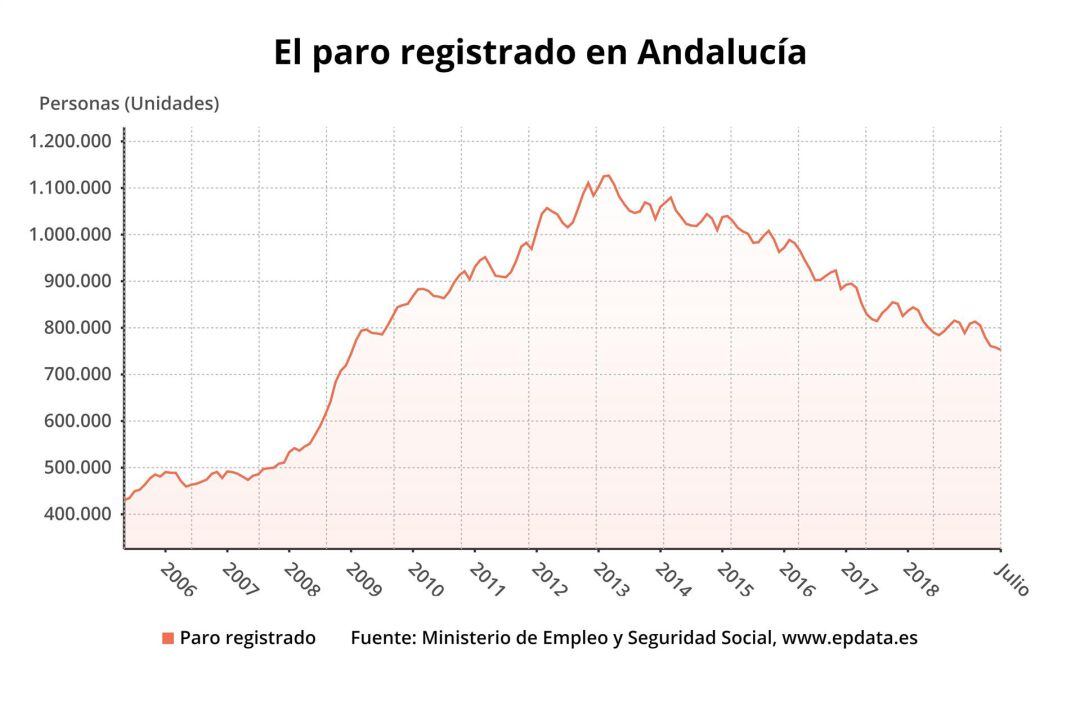 Los descensos en el paro de Andalucía tanto a nivel mensual (-5.100) como interanual (-31.494) representan la mayor bajada en comparación al resto de comunidades, si bien los desempleados de la región andaluza (752.799) representan el 25 por ciento del total nacional.