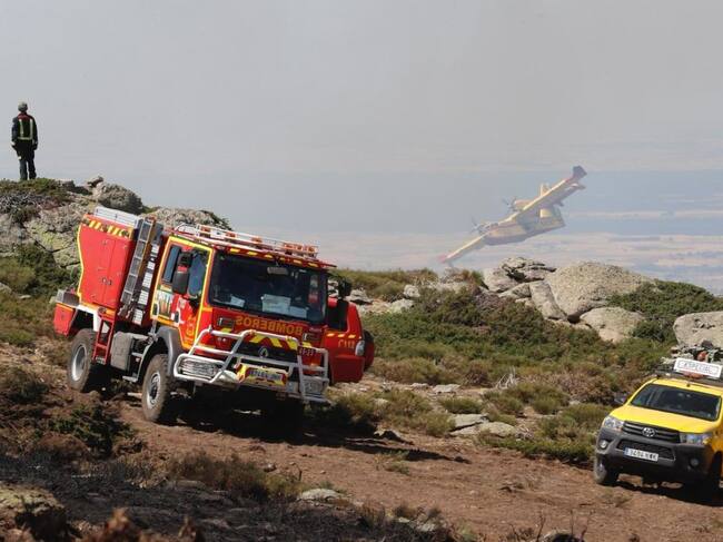 Un total de 19 dotaciones y 2 helicópteros de la Comunidad trabajan en los incendios de Miraflores y La Granja Un camión de bomberos y un vehículo de las brigadas forestales de la Comunidad de Madrid que trabajan en el incendio de Miraflores y de La Granja. (COMUNIDAD DE MADRID)