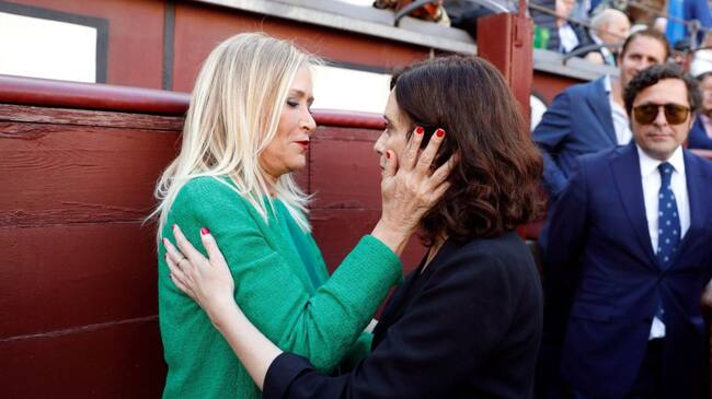 Cristina Cifuentes e Isabel Díaz Ayuso se saludan en la plaza de toros de Las Ventas. / EFE