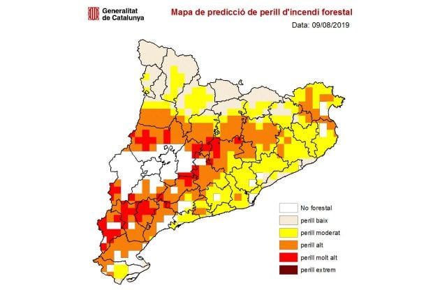 Temperatures per sobre dels 40 graus, vegetació molt seca i nivells d'humitat per sota del 20% han encès totes les alarmes a 71 municipis de l'interior. 13 comarques desperten avui en nivell màxim de risc d'incendi pel qual Protecció Civil ha reforçat els equips de Bombers, Agents Rurals i emergències sanitàries. Els Agents Rurals han barrat el pas a la serra del Montsant i han suspès 1.126 activitats programades a la muntanya. Segons el cap de la divisió d'operacions dels Bombers de la Generalitat, avui un incendi seria molt destructiu i arribarà fàcilment a cremar 1.000 hectàrees.