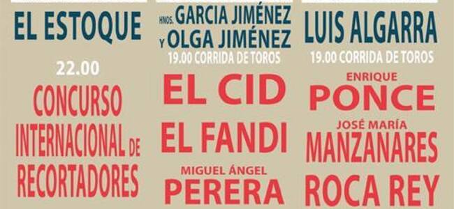 El fin de semana lo abrirá el Concurso Internacional de Recortadores el viernes 30 de agosto. El sábado 30, corrida de toros con El Cid, El Fandi y Miguel Ángel Perera. Y el plato fuerte, el domingo 1 de septiembre, llegará de la mano de Enrique Ponce, José María Manzanares y Roca Rey.