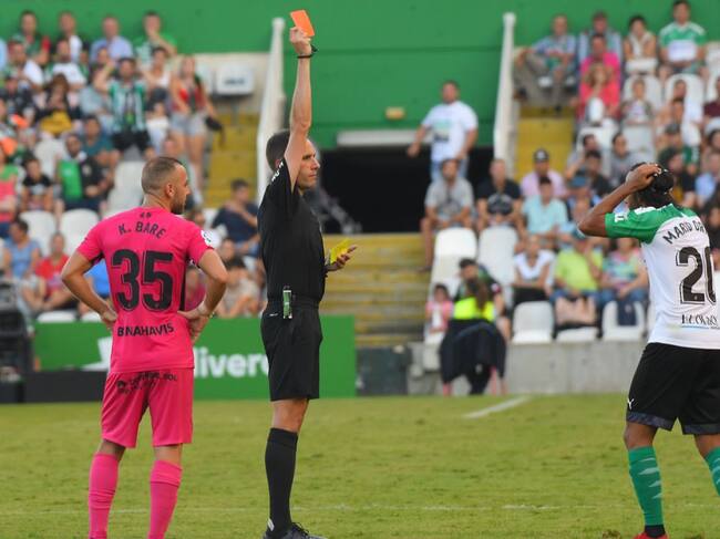 Mario Ortiz no entendió la segunda amarilla, y consiguiente roja, que le enseñó Gorostegui. / Nacho Cubero/Diario AS