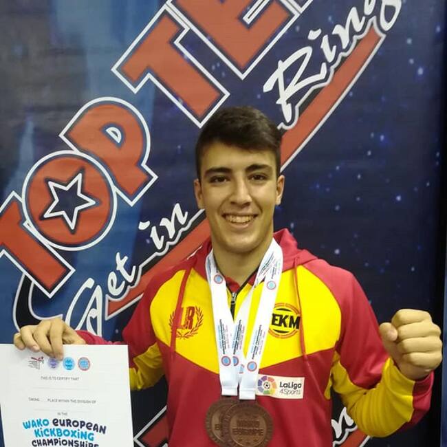 El púgil del HC Fight Gym de Petrer, el eldense Fernando Lopéz Gan se ha colgado la medalla de bronce en la modalidad Lightcontact y Lightcontact (89 kg) en el Campeonato de Europa de Kickboxing WAKO en las categorías infantil, cadete y junior que se está disputando desde el pasado 23 hasta este domingo en el Audi Arena Györ de la localidad húngara de Györ.