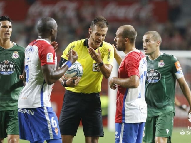 El árbitro señala el penalti ante las protestas de los jugadores del Sporting. / LaLiga.com