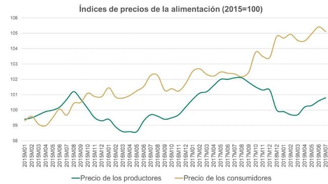 Según los datos de Eurostat, desde 2015, el precio de los alimentos pagado por los consumidores se ha incrementado en España un 5%, mientras que el precio percibido por los agricultores y ganaderos por sus productos solo lo ha hecho en un 0,2 %. En el conjunto de la UE 28, en cambio, los precios a los productores se han comportado mejor, habiéndose incrementado en un 4,1%; mientras que al consumidor lo habrían hecho en un 6,4%.