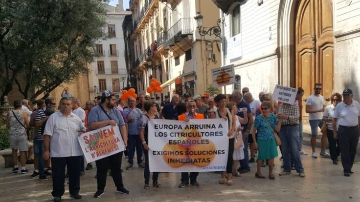 Alrededor de 400 agricultores se han concentrado hoy en Valencia para exigir medidas urgentes por la crisis de los cítricos. Denuncian que los precios del campo de muchos productos agrarios han estado por debajo de los precios de coste de producción.